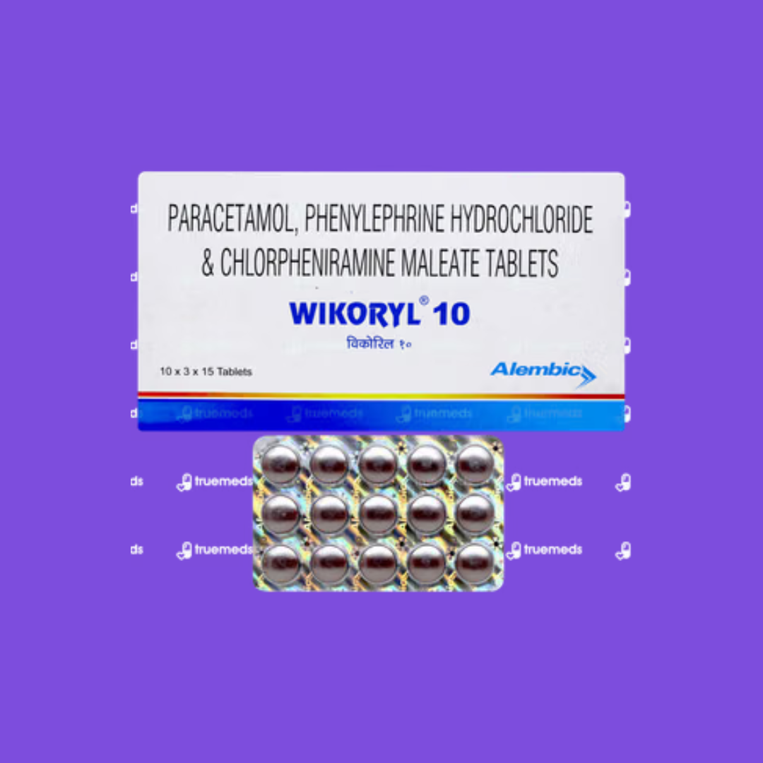 Wikoryl contains Phenylephrine, Chlorpheniramine, and Paracetamol. It provides comprehensive relief from common cold symptoms including nasal congestion, runny nose, sneezing, body ache, and mild fever. Phenylephrine acts as a decongestant while Chlorpheniramine is an antihistamine that controls allergies.
