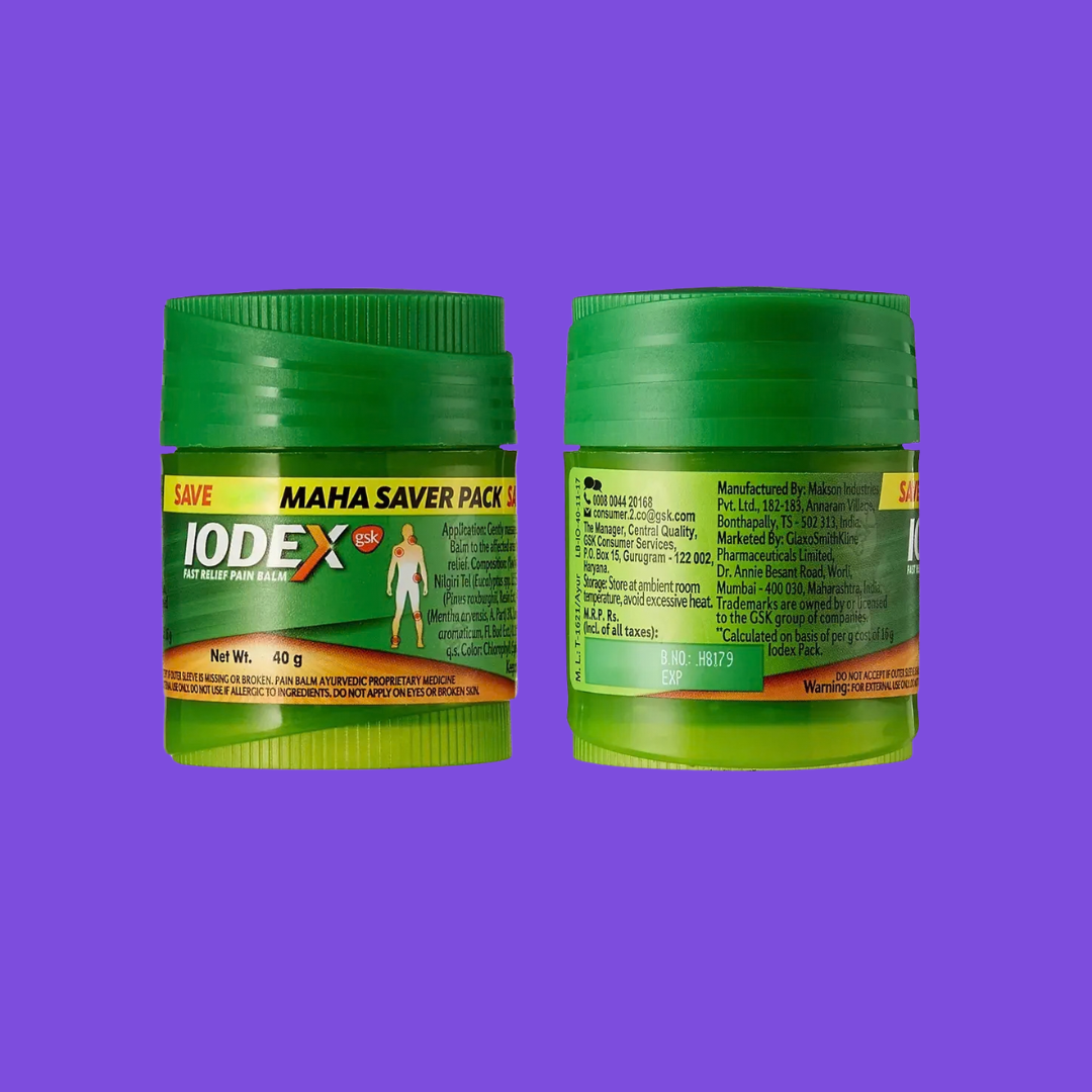 Iodex contains Methyl Salicylate, Menthol, and Turpentine Oil. It has been trusted by Indian families for generations for joint pain, back pain, and muscle stiffness. The warming formula increases blood circulation to the affected area and provides deep relief. Its distinctive smell is recognized by every Indian household.